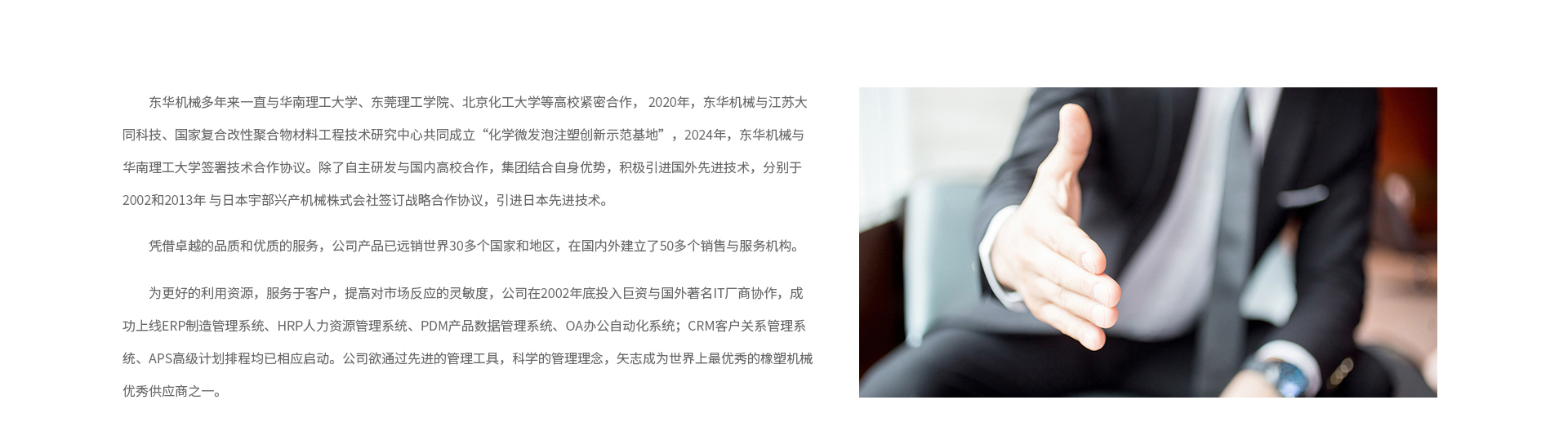 東華機(jī)械有限公司是大同機(jī)械有限公司(港股上市企業(yè))旗下核心子公司,1986年成立,主營全自動(dòng)注塑機(jī)及其附屬設(shè)備的生產(chǎn),公司占地面積約20萬平方米,員工近1000人。公司以產(chǎn)品規(guī)格齊全著稱國內(nèi)同行,以專業(yè)生產(chǎn)特大型注塑機(jī)稱雄塑機(jī)行業(yè),以技術(shù)與產(chǎn)品創(chuàng)新引領(lǐng)國內(nèi)產(chǎn)品發(fā)展,目前公司在華南和華東地區(qū)設(shè)有注塑機(jī)生產(chǎn)基地,是我國目前最大型的塑料機(jī)械生產(chǎn)基地之一。公司配備了一整套先進(jìn)完備的設(shè)計(jì)、生產(chǎn)、加工、裝配及檢測設(shè)備,擁有各類金屬切削設(shè)備100多臺(tái),(其中數(shù)控加工設(shè)備近80臺(tái))。公司可一次性提供全套注塑機(jī)及其配套設(shè)備,注塑量從43g到300,000g,合模力從25噸至4500噸,共有90多個(gè)規(guī)格、百余種款式,年產(chǎn)能力達(dá)5千臺(tái)以上。