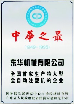 1993年東華公司在國內(nèi)首先突破特大型注塑機(jī)的設(shè)計(jì)和工藝技術(shù),成功設(shè)計(jì)制造出國內(nèi)首臺(tái)2500噸合模力的TTI-2500B特大型注塑機(jī),填補(bǔ)了我國大型注塑機(jī)的空白,獲得了國務(wù)院頒發(fā)的“中華之最”榮譽(yù)證書;同年在國內(nèi)塑機(jī)行業(yè)首家獲得高新技術(shù)企業(yè)認(rèn)定證書和ISO9001質(zhì)量體系認(rèn)證證書; 2001年研制出國內(nèi)第一臺(tái)環(huán)保節(jié)能高效的電動(dòng)注塑機(jī);2004年,被廣東省科技廳評(píng)為優(yōu)秀高新技術(shù)企業(yè)。